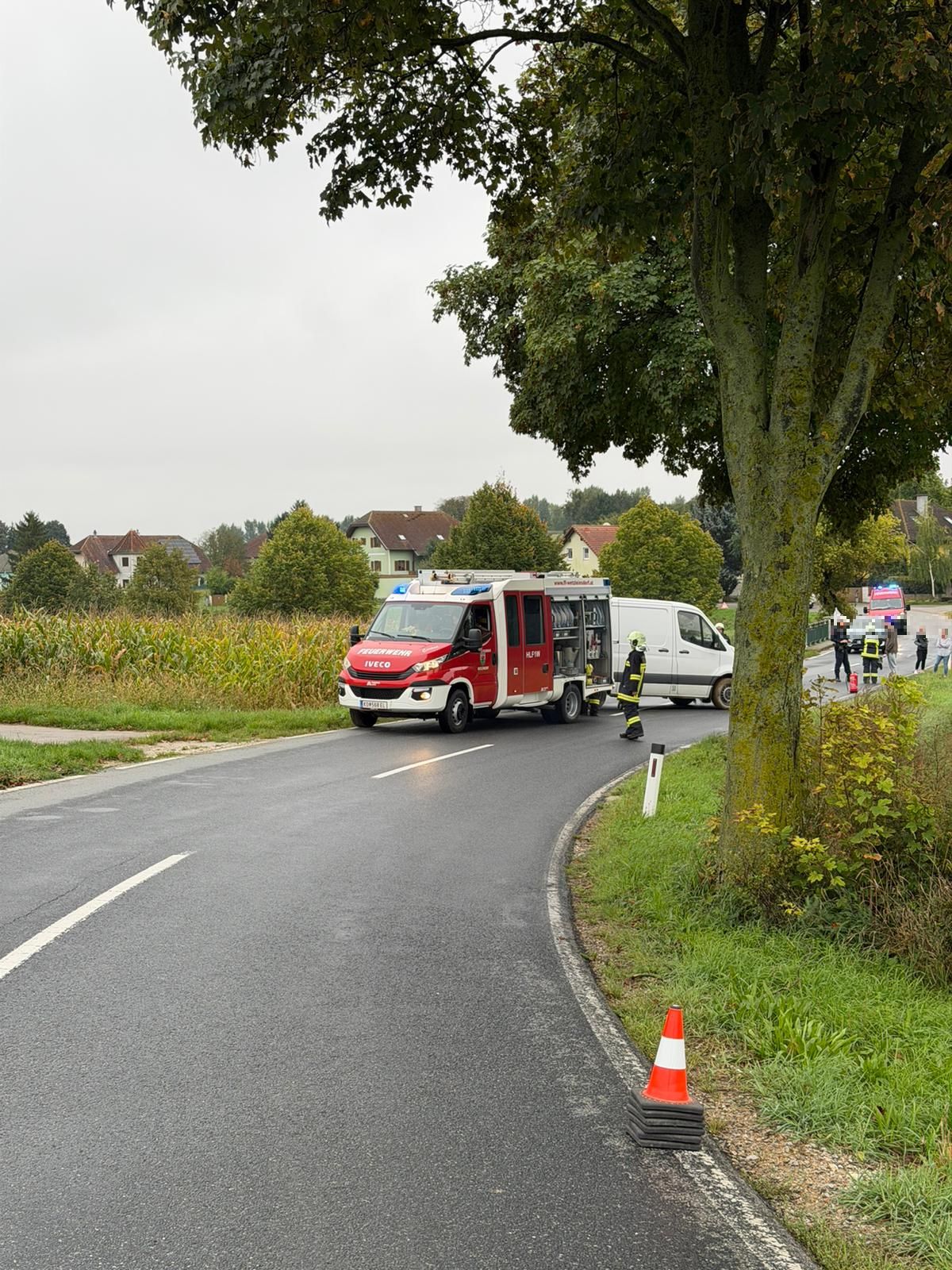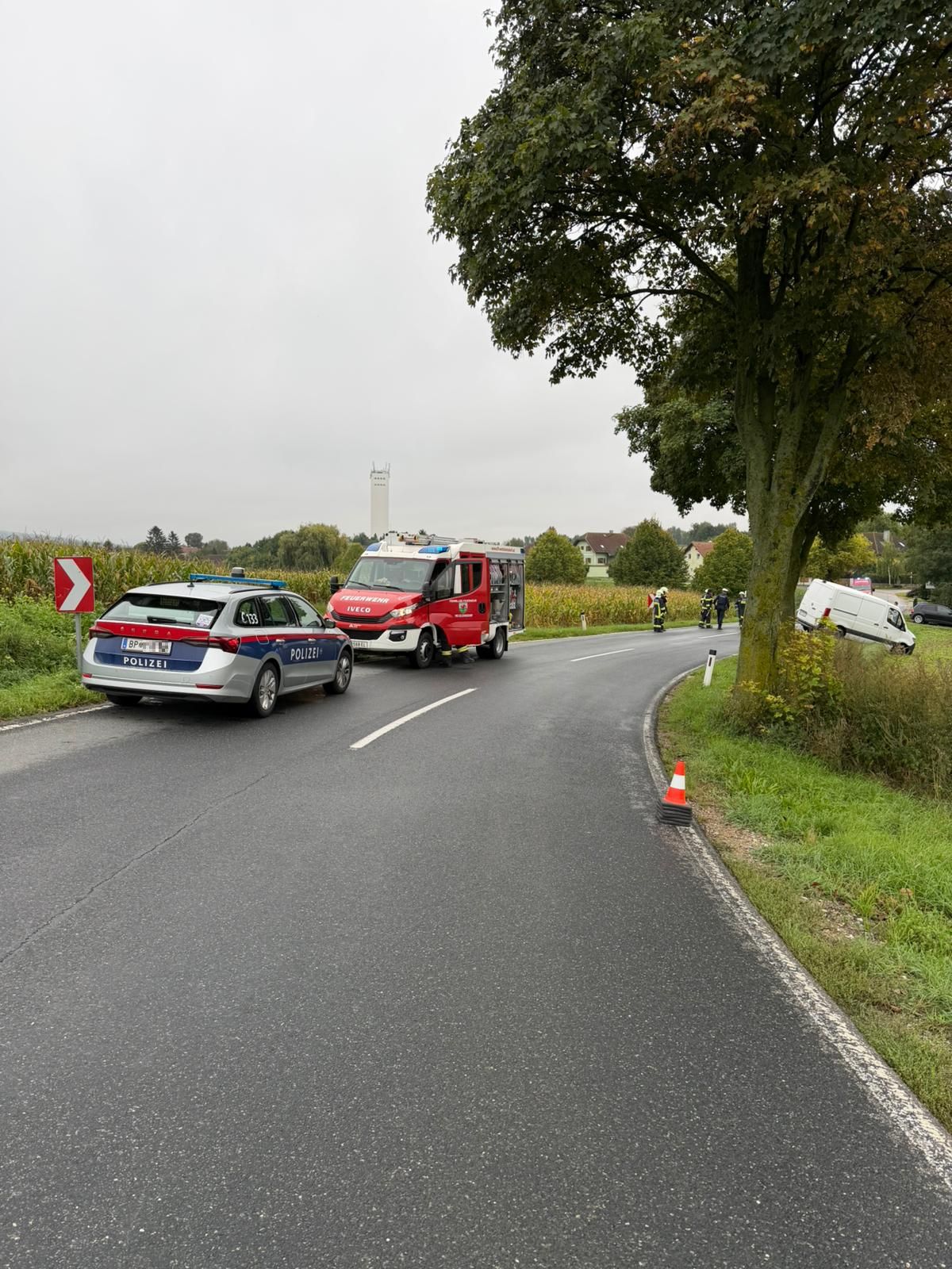 Ein Kleintransporter kam aufgrund der nassen Fahrbahn von der Straße ab.