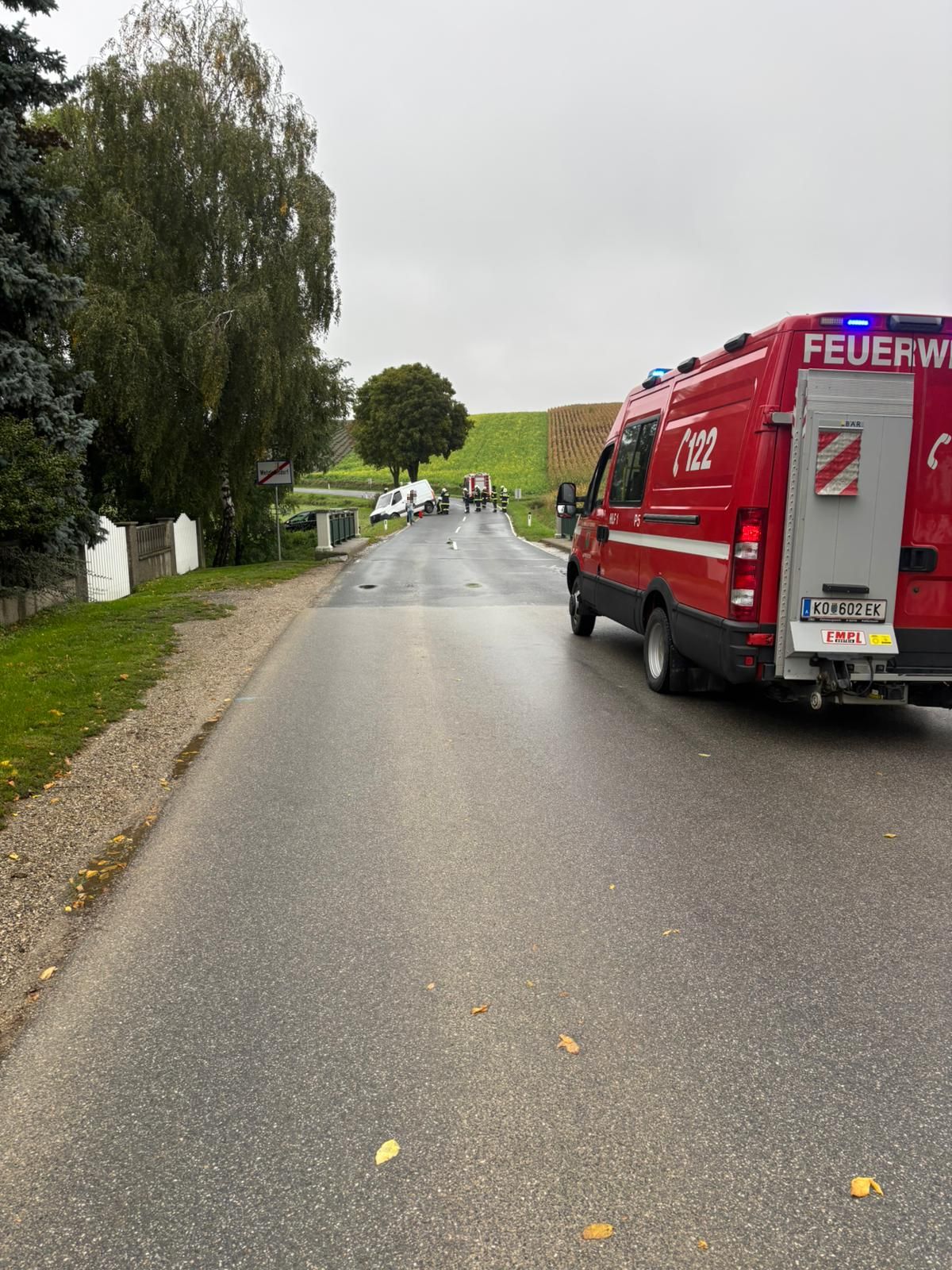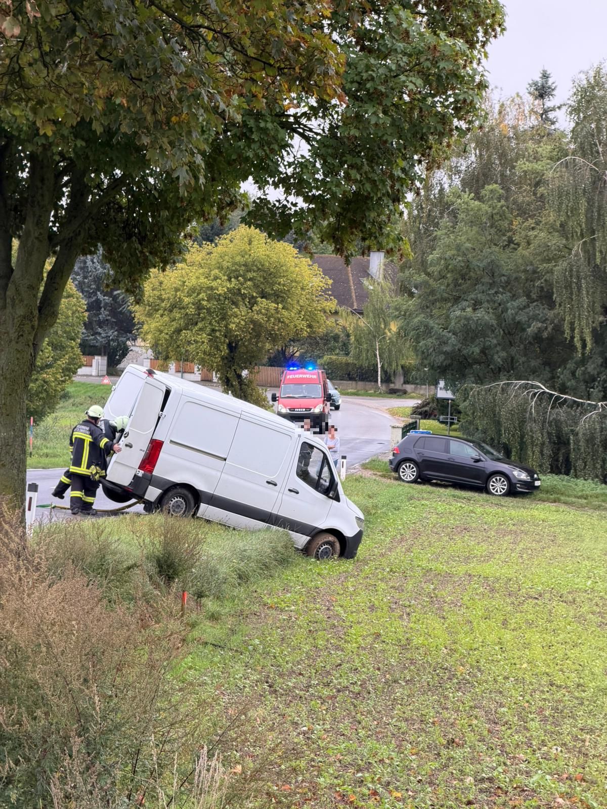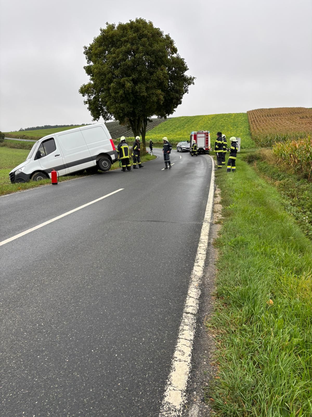Ein Kleintransporter kam aufgrund der nassen Fahrbahn von der Straße ab.
